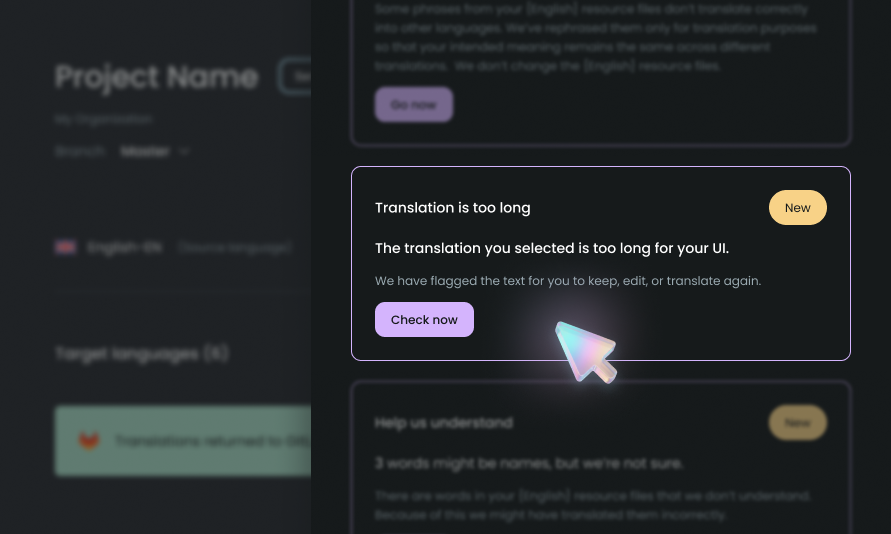 PTC passt Übersetzungen an Ihre UI-Beschränkungen an und verhindert Layout-Fehler, bevor sie entstehen. Jede Übersetzung ist für Schaltflächengrößen, Labellängen und Bildschirmplatz optimiert.