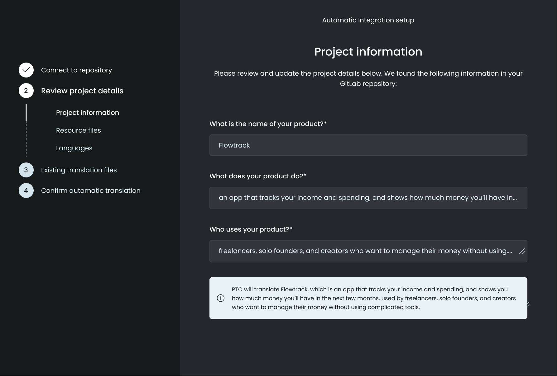When you describe your product and audience during setup, PTC uses that context to pick the right tone. Friendly, formal, technical, or playful—whatever fits. A financial tool shouldn’t sound like a gaming app. And with PTC, it won’t.