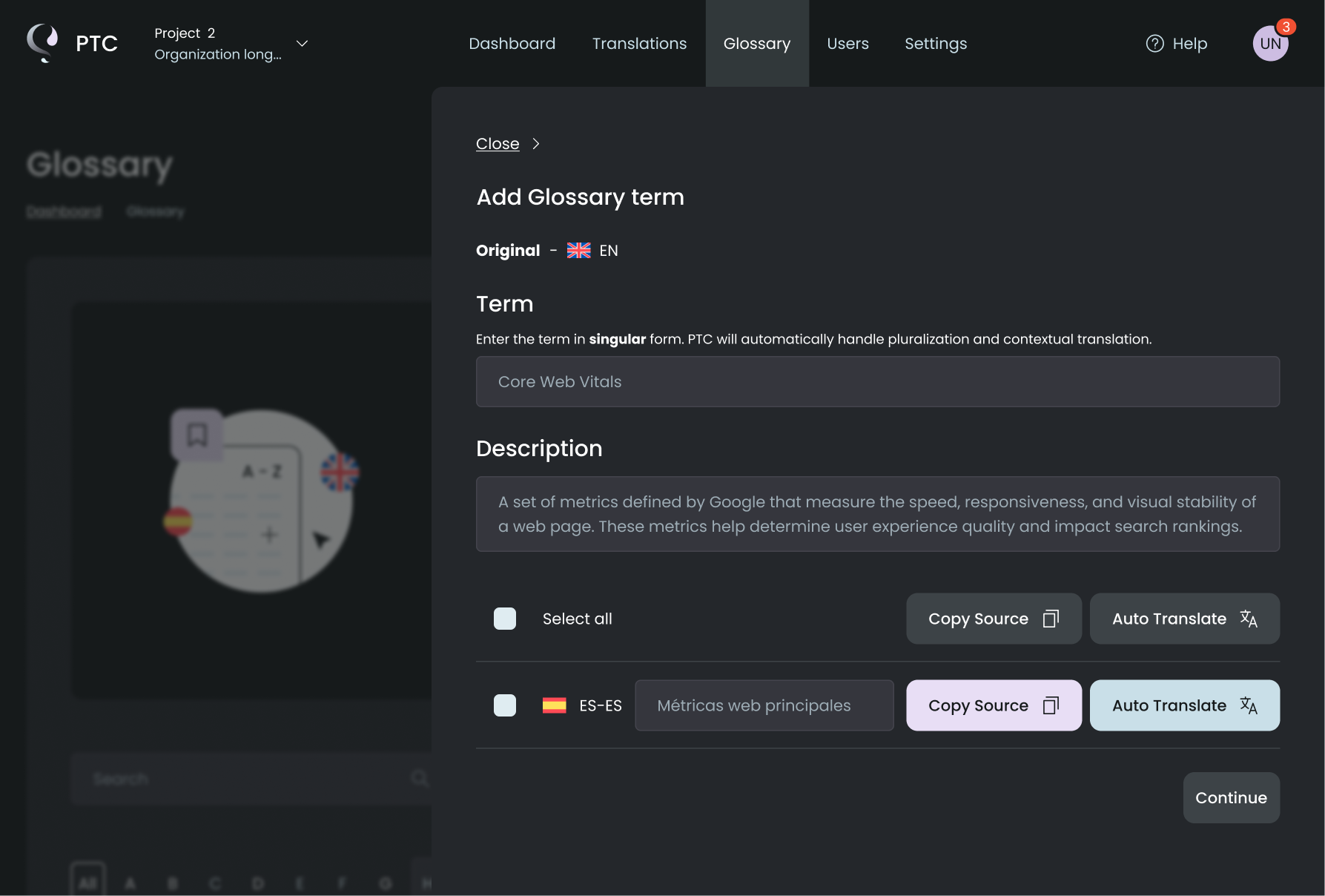 Tell PTC what your product is, who it’s for, and which terms matter. From that point on, every translation reflects your voice, your brand, and your expertise—without extra manual work.