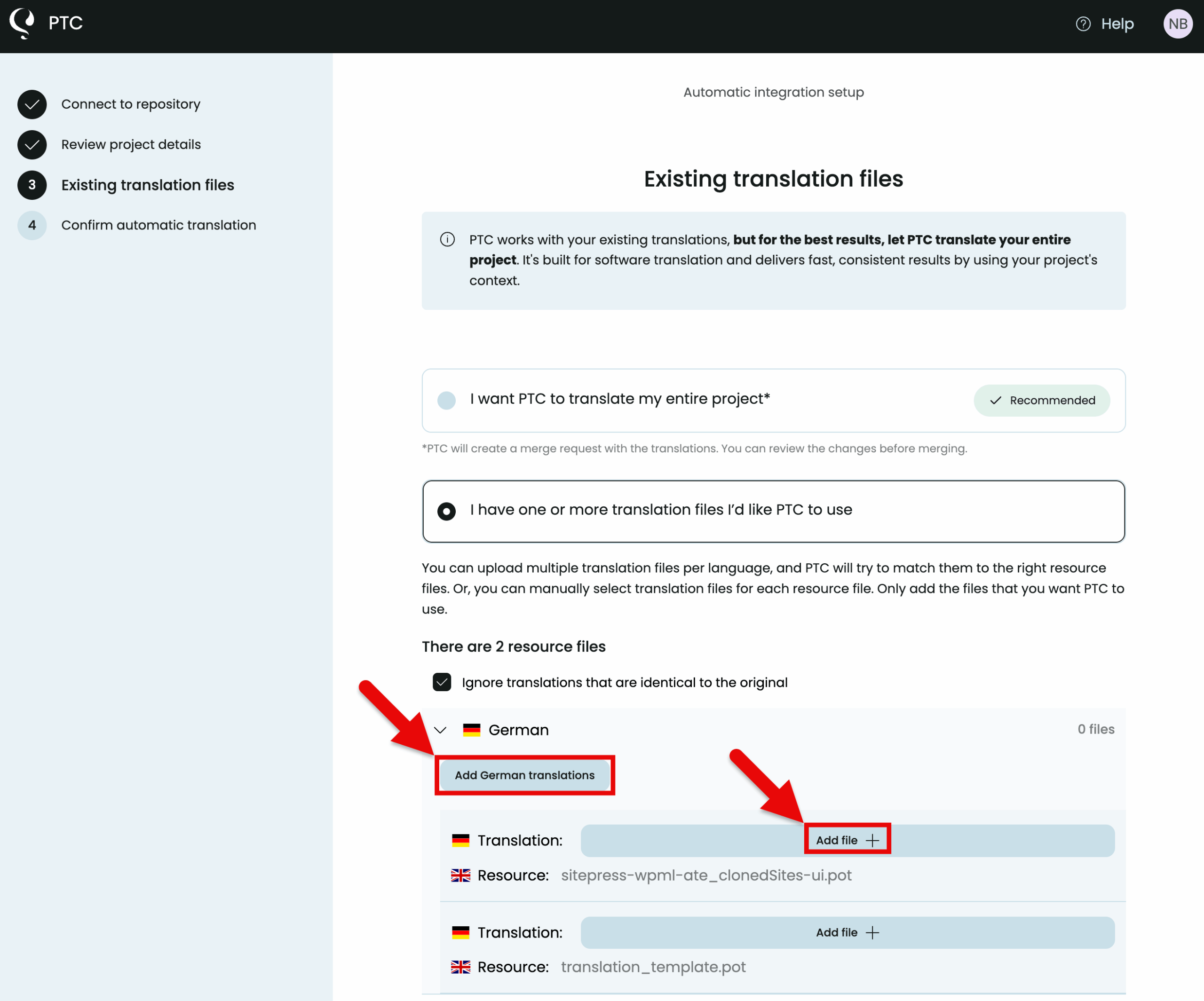Aunque PTC permite subir traducciones ya existentes, recomendamos dejar que traduzca su proyecto desde cero siempre que sea posible.