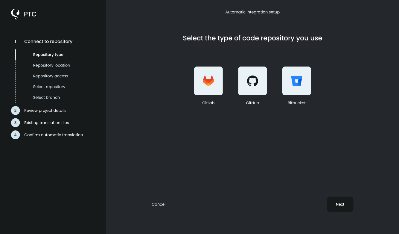 Utilisez cette option pour une localisation automatisée et continue. PTC surveille votre dépôt GitHub, GitLab ou Bitbucket, traduit le contenu mis à jour et renvoie les traductions via des demandes de fusion.