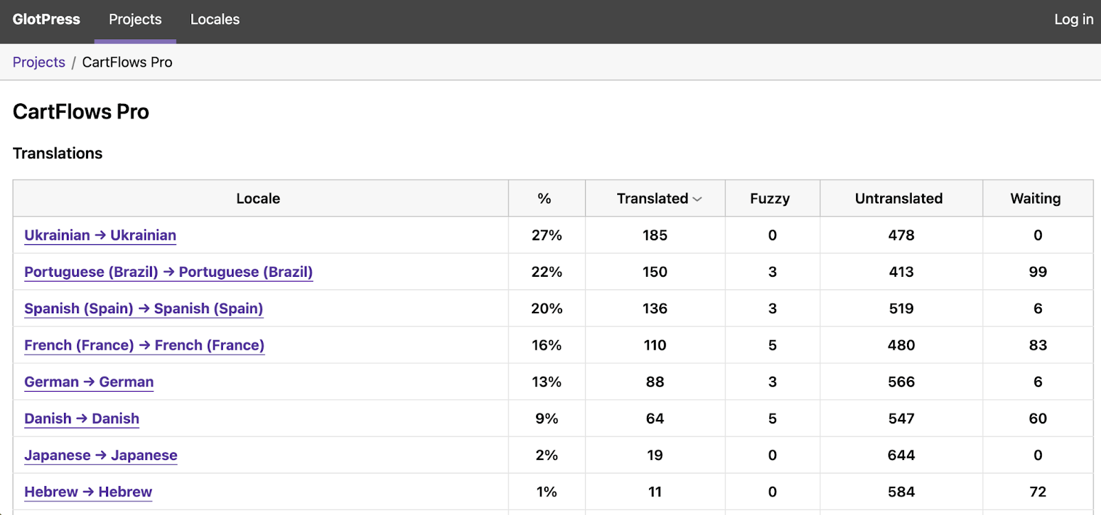 You host your own GlotPress instance on a WordPress site where you can invite translators. You then review and approve translations to get to 100% for each language. The image is an example from CartFlows Pro.