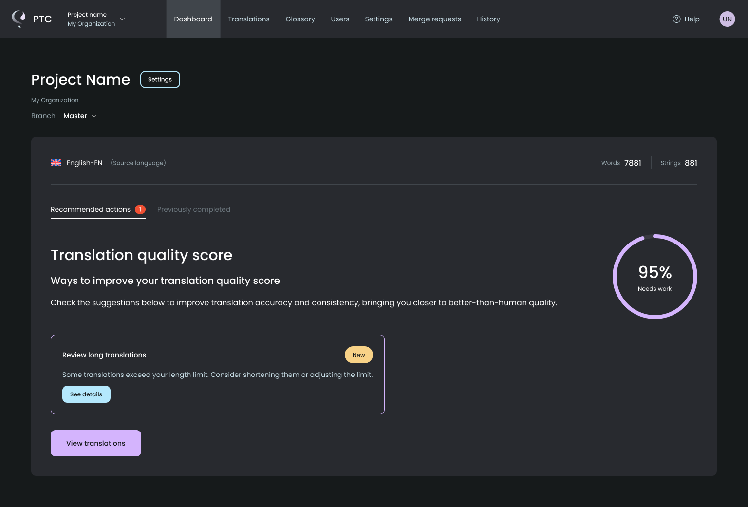 PTC then sends a merge request to your repository so you can check and use translations right away. The system will also show a translation quality score and make easy-to-check suggestions that bring translations closer to perfect.